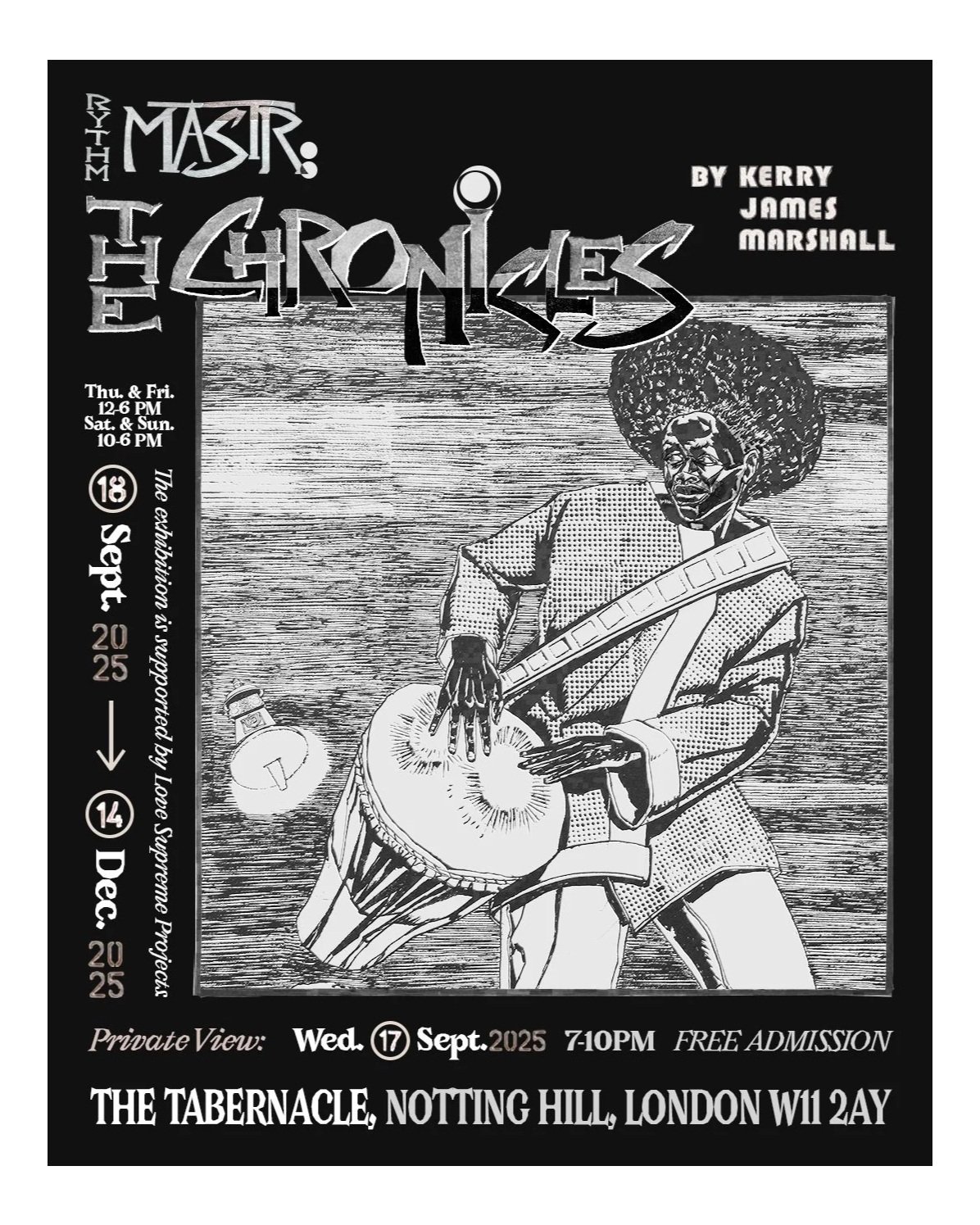 Rythm Mastr: The Chronicles is an exhibition dedicated to a comic series by Kerry James Marshall. It will be the first show in the UK to delve into this long-running project that has occupied Marshall for over twenty-five years. Like his paintings, the Rythm Mastr series addresses the absence of Black figures in art history. However, by tackling this underrepresentation through a popular medium that is also undervalued, Marshall builds a spectacular world that rivals those created by Marvel and DC.